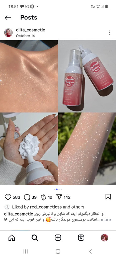 یک نمونه وارداتی آوردم مناسب دخترای ادایم!بوی یک شیک توت فرنگی و وانیلی خوشمزه داره! خیلی خیلی سبک عاشق همین بافت سبکش شدم انگار هیچی رو پوست نیست ولی بشدت پوست براق و لطیف میشه! ازش کم بزنید چون موقع ماساژ حجمش 4 برابر میشه!! ماندگاری رایحه و مقدار ابرسانیش تا 72 ساعت رو پوست میمونه! ولی هیچی اون شاین دلبرش و برق خوشگلش رو پوست نمیشه! فقط دخترا اینو جدی میگم پارتنرهاتون در برابرش توانای مقابله ندارن و میچلوننتون!