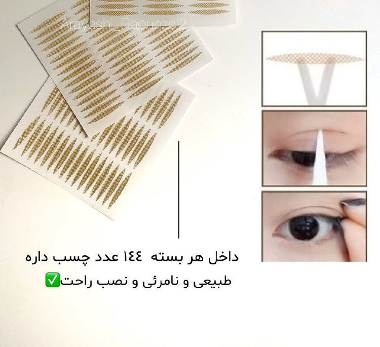 هر پک 144 چسب داره که کاملا نامرئی و اصلا شل نمیشه! کافی پشت پلک رو پاک کنی بعد با کمک موچین چسب رو پشت پلک بزنی!
