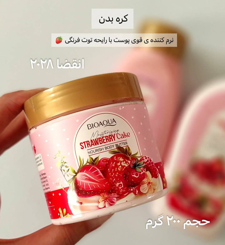 استفاده ازش مانع از پوست مرغی، خشکی، اگزما و تیرگی بدن میشه! یک رایحه جذاب از کیک توت فرنگی داره که دلت رو میبره!🎀🍓